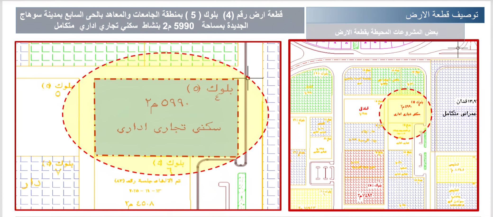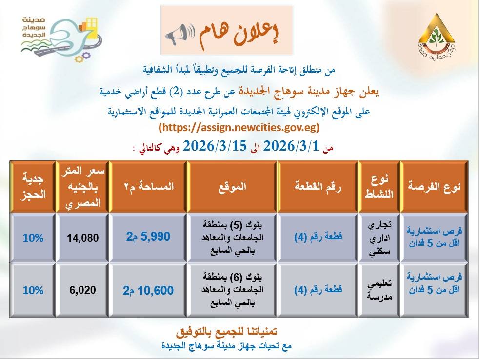 وتطرح بمدينة سوهاج الجديدة أرض بنشاط تجاري اداري بمساحة 5990 متر بسعر 14080 جنيه وأرض بنشاط تعليمي بمساحة 10600 متر بسعر 6020 جنيه.