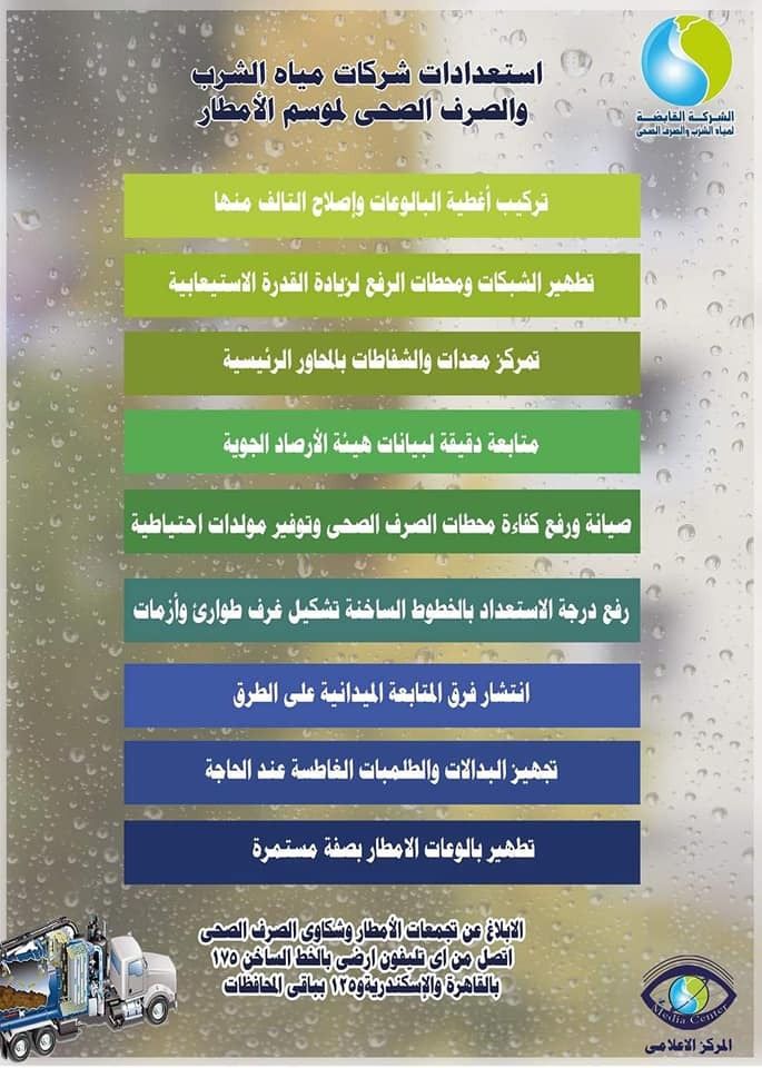 ناشدت الشركة القابضة لمياه الشرب والصرف الصحى المواطنين، بضرورة ترشيد استهلاك المياه خلال فترة سقوط الأمطار، لتخفيف الضغط على شبكات الصرف الصحي، لاستيعاب أكبر كمية ممكنة من مياه الأمطار.
