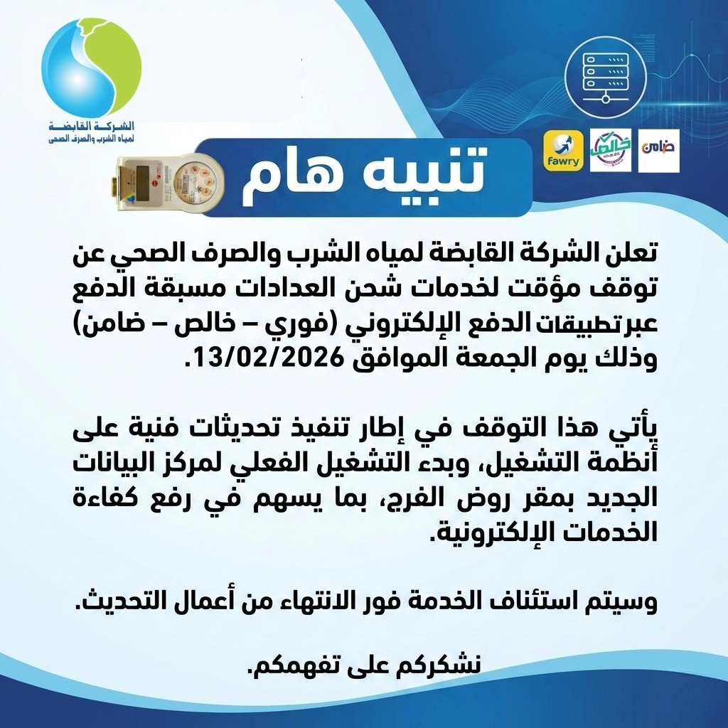 أعلنت الشركة القابضة لمياه الشرب والصرف الصحي انه في إطار ضمان كفاءة واستقرار الخدمات المقدمة للمواطنين، وتفادي حدوث أي مشكلات فنية أثناء عمليات شحن العدادات مسبقة الدفع، تعلن الشركة عن توقف مؤقت لخدمات شحن العدادات مسبقة الدفع عبر تطبيقات الدفع الإلكتروني، ومنها فوري وخالص وضامن، وذلك يوم الجمعة الموافق 13/02/2026.