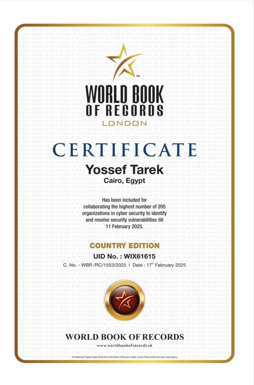 في إنجاز مصري غير مسبوق، سجل الشاب المصري «يوسف طارق»، رقمًا قياسيًا عالميًا في الكتاب العالمي للأرقام القياسية (World Book of Records) كأكثر متخصص في الأمن السيبراني تعاونًا مع منظمات وشركات حول العالم لتحديد الثغرات الأمنية وإصلاحها. بلغ عدد الشركات التي تعاون معها 205 شركة، مما يعكس تأثيره الكبير في تعزيز أمن المعلومات على مستوى عالمي.