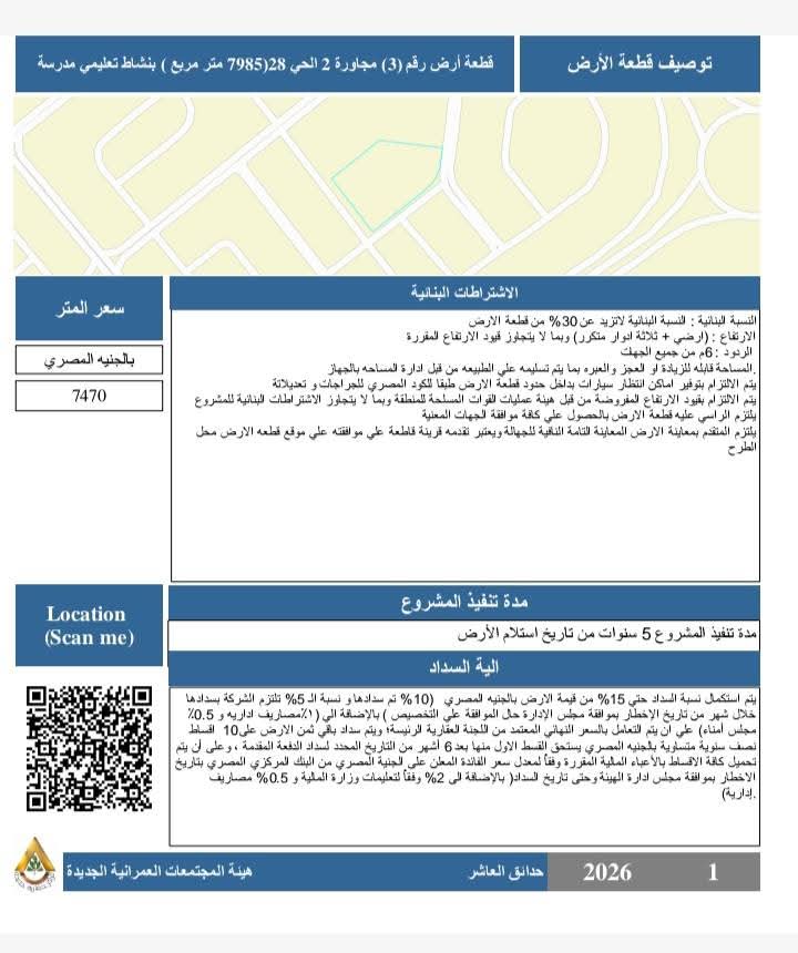 ويؤكد جهاز المدينة أن المرحلة الحالية تمثل فرصة استثمارية واعدة للمشاركة في مسيرة النهضة العمرانية والاقتصادية المتسارعة التي تشهدها المدينة ، مجددًا دعوته للمستثمرين الجادين لاغتنام هذه الفرص التي تحقق قيمة مضافة حقيقية، وتعود بالنفع على المستثمر والمجتمع، في إطار رؤية الدولة المصرية لتعظيم العائد من موارد المدن الجديدة ودعم التنمية الشاملة.