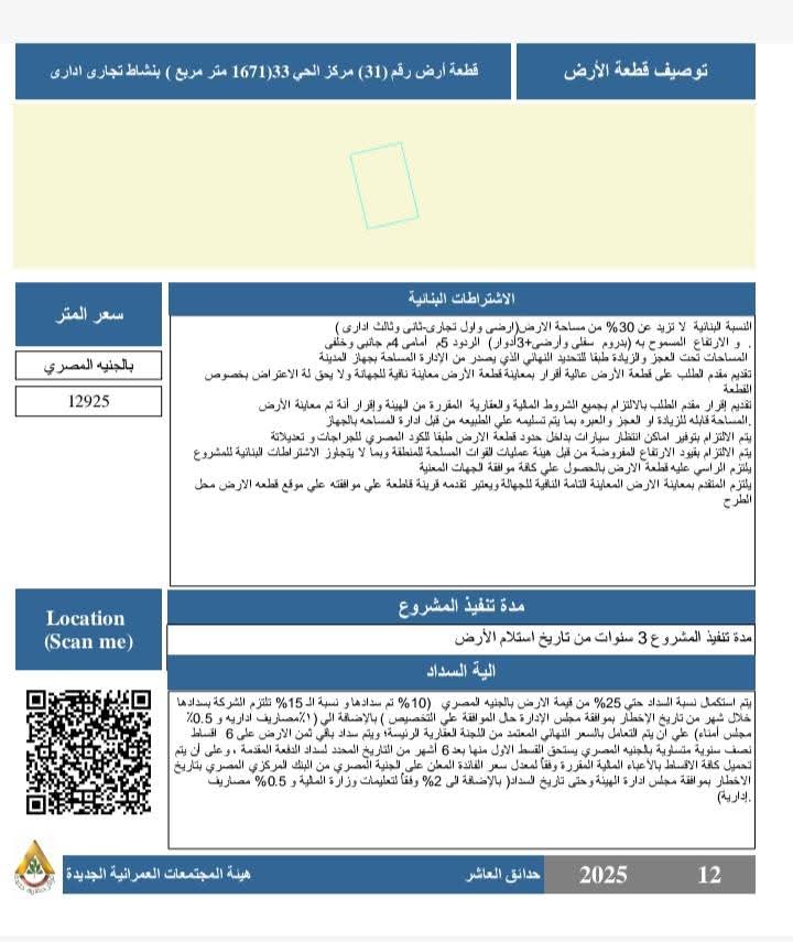 وأوضح رئيس الجهاز أن هذا الطرح يأتي ضمن رؤية متكاملة تستهدف توسيع قاعدة الأنشطة الاقتصادية والخدمية داخل المدينة، من خلال إتاحة أراضٍ بمواقع متميزة متعددة تشمل انشطة تجارية، وإدارية، وخدمية، بما يسهم في رفع كفاءة الخدمات المقدمة للمواطنين، ويعزز من مكانة المدينة اقتصاديا.