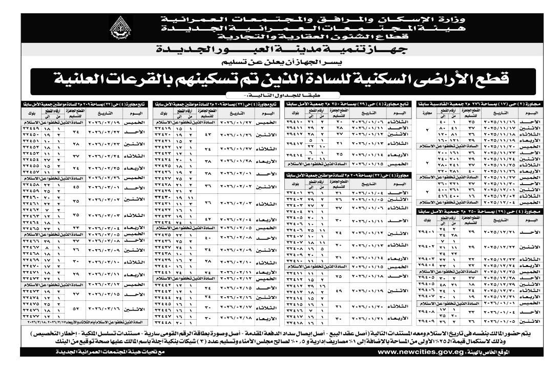 أعلن المهندس محمود مراد، رئيس جهاز مدينة العبور الجديدة، عن بدء تسليم 2045 قطعة أرض سكنية للفائزين بالقرعات العلنية، وذلك بمناطق الأمل والقادسية سابقًا بدءاً من يوم ١٦ نوفمبر المقبل.