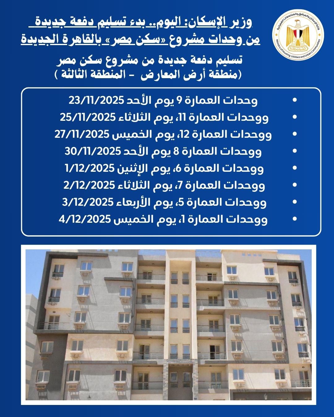 وأوضح المهندس أحمد رشاد، رئيس جهاز تنمية مدينة القاهرة الجديدة، أنه سيتم تسليم دفعة جديدة من مشروع سكن مصر (منطقة أرض المعارض – المنطقة الثالثة )، حيث سيتم تسليم وحدات العمارة 19، يوم الثلاثاء 4/11/2025، ووحدات العمارة رقم 18، يوم الخميس 6/11/2025، ووحدات العمارة 13، يوم الأحد 9/11/2025، ووحدات العمارة 16، يوم الثلاثاء 11/11/2025، ووحدات العمارة 15، يوم الخميس 13/11/2025، ووحدات العمارة 17 يوم الأحد 16/11/2025، ووحدات العمارة 10، يوم الثلاثاء 18/11/2025، ووحدات العمارة 14، يوم الخميس 20/11/2025.