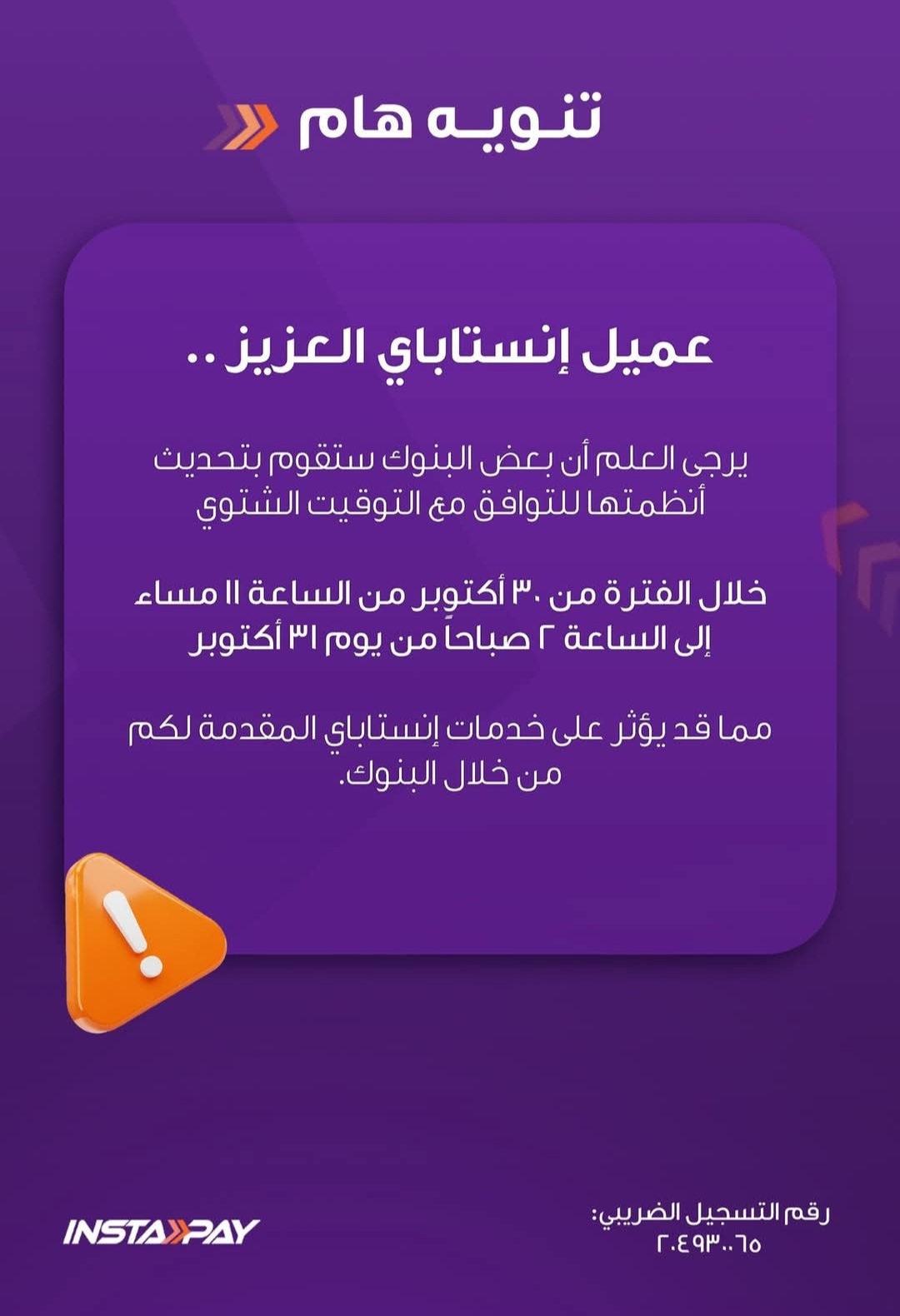 أعلن تطبيق التحويلات والمعاملات المالية، إنستاباي InstaPay Egypt، عن إيقاف خدماته بداية من الساعة 11 مساء اليوم حتى الساعة 2 صباحا غدا الجمعة بسبب تحديث عدد من البنوك المصرية أنظمتها التقنية للتوافق مع بدء التوقيت الشتوي لعام 2025.