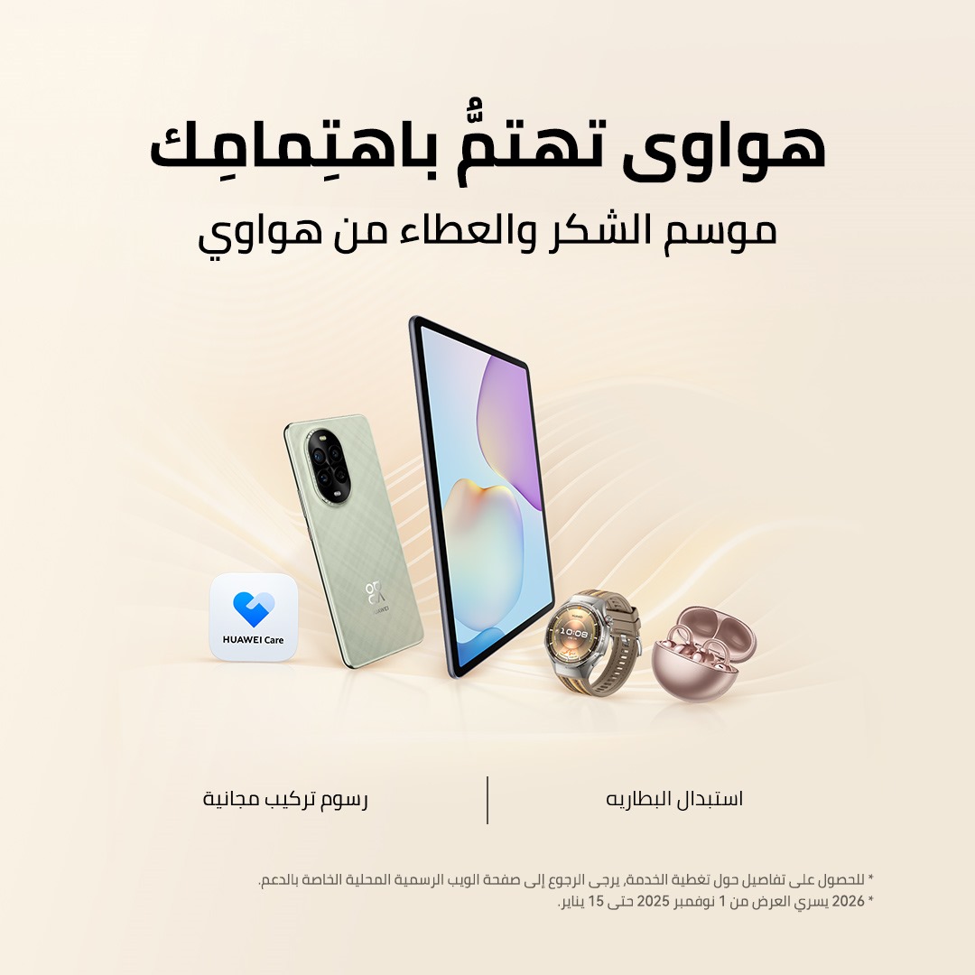 أعلنت شركة هواوي عن عروض وخصومات حملة موسم الشكر، والتي انطلقت بداية من 1 نوفمبر الجاري وتستمر حتى 15 يناير 2026.