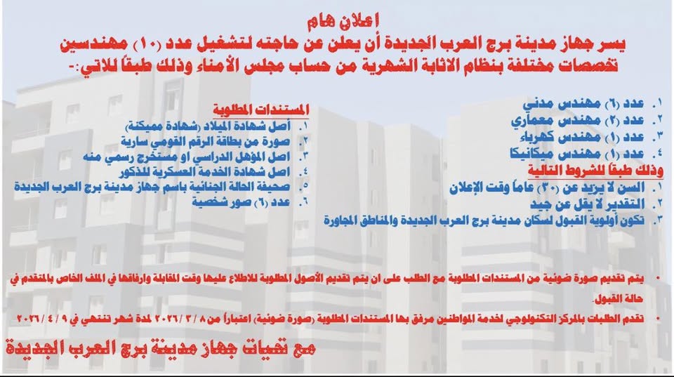 وأشار الإعلان إلى أن المستندات المطلوبة تتضمن: أصل شهادة الميلاد (شهادة مميكنة)، وصورة بطاقة الرقم القومي سارية، وأصل المؤهل الدراسي أو مستخرج رسمي منه، وأصل شهادة الخدمة العسكرية للذكور، وصحيفة الحالة الجنائية موجهة باسم جهاز مدينة برج العرب الجديدة، بالإضافة إلى عدد (6) صور شخصية.