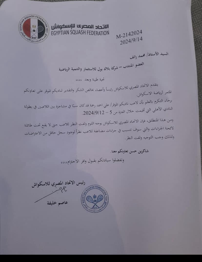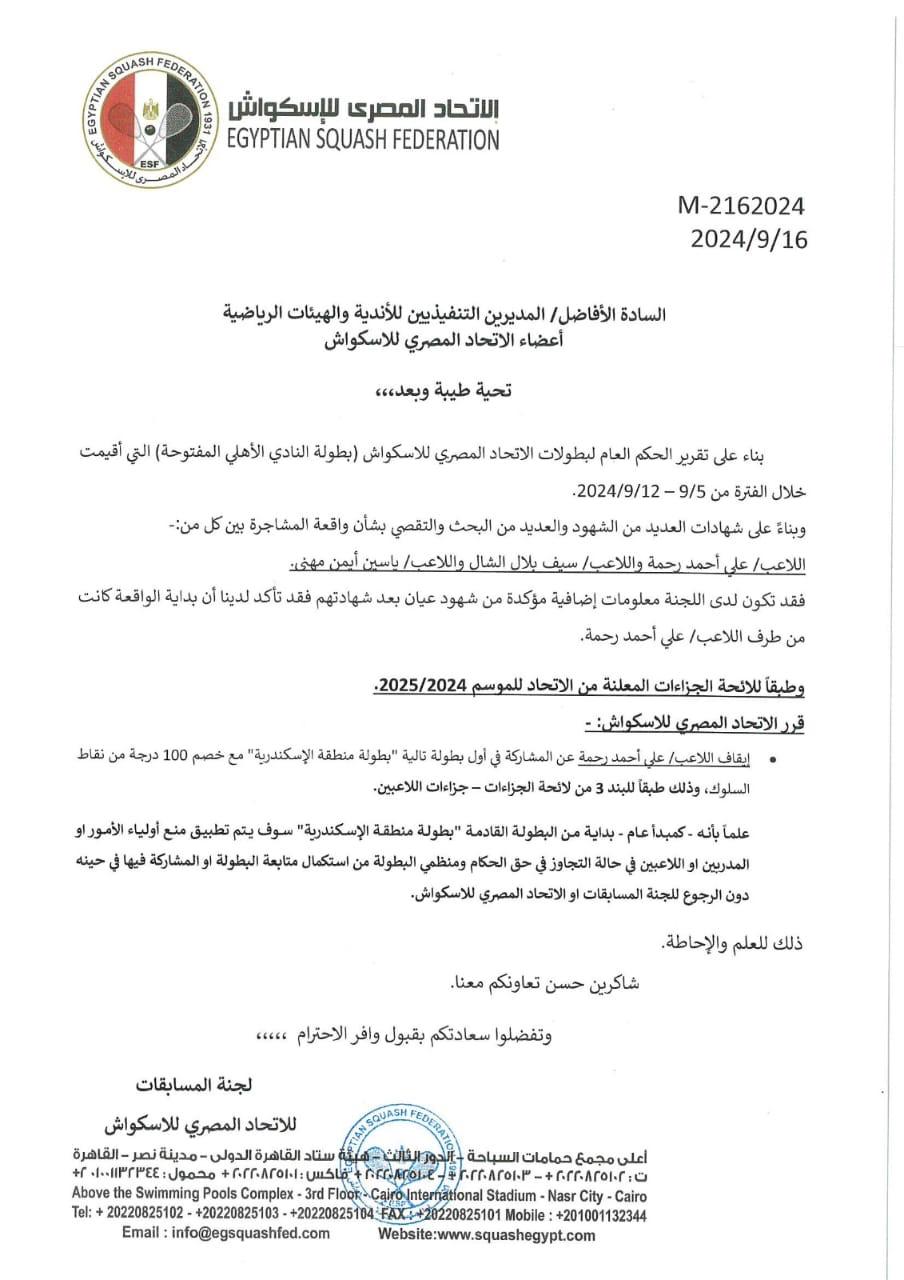 حول نفس الواقعة و بناء على تقرير الحكم العام لبطولات الاتحاد المصري للاسكواش وبناءً على شهادات العديد من الشهود والعديد من البحث والتقصي بشأن واقعة المشاجرة’ مؤكدة من شهود عيان بعد شهادتهم فقد تأكد لدينا أن بداية الواقعة كانت من طرف اللاعب علي أحمد رحمة ‘ .